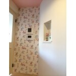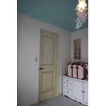 輸入クロスや、パステルカラーがきれいなオガファーザー&リボス塗りの天井、 ガラスブロックやニッチと、「かわいい」が満載のお部屋。 扉を開けると、また違うおとぎ話の世界に入っていきそうなアンティーク風の建具は、ブラックの取手をアクセントにしました。