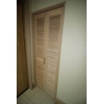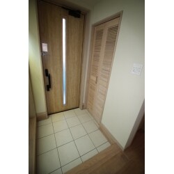 木目調のやさしい色合いの玄関ドア。 シューズクローゼットの入口は、ガラリのオリジナル造作建具。 風通しの良いガラリ建具は、湿気のこもりやすい場所や、臭いが気になる場所への通気が可能。 機能的な上、木の風合いを感じることができる温かみのある雰囲気が人気です。 土間には、45cm角のシンプルなタイルを使用。 明るく、あたたかみのある玄関になりました。