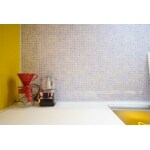 キッチンパネルは旦那様のセレクト。ブルーミックスのシェルタイル柄パネル×黄色いキッチンがカラフルで楽しい雰囲気にしてくれています。
