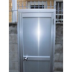 【施工前】 屋根のない場所に設置してあるドアなので、どうしても雨水・紫外線の影響を受けてしまいます。 木製の枠は傷み、ドアには傷・へこみ・サビがみられました。