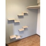 壁設置のキャットウォークを互い違いに取り付けることで狭い範囲で階段をのぼる動線を作りました。また、ベッドが2つ置けるように一番上のスペースを広く取り、置ける形状に造作。