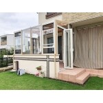 ガーデンルーム内と外の空間をしっかり分けました。 右側の折れ戸パネルは柱部を切り詰めてサイズを調整し、きれいに納めました。