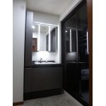 浴室を広くしたので間口が120センチから9センチに狭くなるので、1センチの収納庫と7センチの洗面台でオールスライド引出タイプをお勧めしました。又自動水栓をお勧めしました。