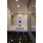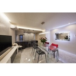 水廻りを1階にまとめ、広いLDKへと間取りを変更しました。生活感をなくし全体的にスッキリとしたイメージになるよう、収納は引き戸などを用いて見せる収納はせず隠す収納にしました。 床の大理石風のフロアタイルに違和感の出ないように何度もお打合せを重ね、素材に合わせて照明の種類を選定し、家具や扉などのトータルコーディネートにこだわりました。 各箇所に使用したタイルは、より際立つよう間接照明の配置を考え、間接照明や鏡などをコーディネートしてラグジュアリーな空間に仕上がりました。
