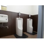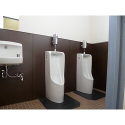 自動水栓付の小便器に、床にはハイドロセラフロアーを貼り掃除がしやすくなりました。