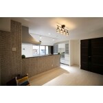 リビング側から見えるキッチン前面と壁の一部に細かめのタイルを採用し、とてもオシャレな雰囲気のリビングに仕上げました。 ホワイトを基調に、タイル、リビングドア、照明をブラウン系でまとめ、明るいお部屋ながらもホッとする印象のリビングルームです。