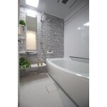 バスルームは弊社おすすめのTOTO社製WG。お手入れ楽々、ほっカラリ床で冬でも暖かくお風呂に入ることができます。 アクセントパネルには、淡いグレーを採用し、小ざっぱりとした印象に。