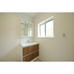 洗面化粧台・収納・洗濯機が一体となった統一感のある洗面所。