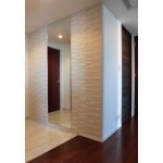 空間のアクセントとして、エコカラット グラナスルドラ LIXIL ECP 2515NET LDR4N ホワイト を貼りました。鏡を設置することで、空間に広がりが出来ました。