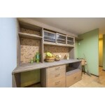 ご希望のオーブンのサイズに合わせてカウンターの奥行を決め、ゴミ箱がぴったりはいるようオーダーメイドで製作しました。引き出すことができる家電収納も設置し、吊戸は奥様のお好みのチェッカーガラスの扉をつけました。