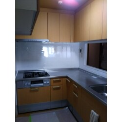 リフォーム後の写真です。 壁も造作しシンク側は対面形式にしました。 キッチンのコンロ側の壁にはキッチンパネルを張りました。