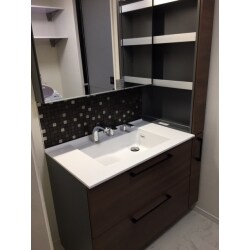 洗面化粧台のレイアウトは今まで使い勝手よく使っていた、とお聞きしたのでほとんどレイアウトは変えずに、ご提案として鏡収納と洗面ボールの間にタイル貼りをおすすめしました。