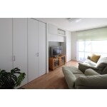 DKに隣接した和室を解体し、リビングに改修するにあたって、LDKまわりでお使いの物を効率的に収められる壁面収納を造作しました。隣家が迫り、十分な採光がとれなかった窓の上部を活用して吊戸を新設。エアコンの目隠しも兼ねています。また、寸法に応じて、収納扉には既製品と造作とを採用。それらの調和を図ることで清々しい空間を実現しています。