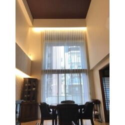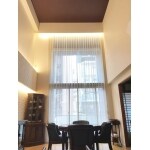 お客様がお選び頂いた木目クロスが、吹抜けの大空間を引き締め、エコカラットと間接照明、暖炉が高級感のある雰囲気を演出しています。