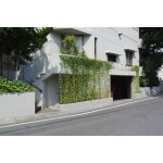 1階ガレージの外壁にステンレスワイヤーを格子状に張り、道路際に花壇を設置。常緑つる性のハゴロモジャスミンを植えて、数年かけて緑化する計画です。設置から2年が経ち、だんだんと葉が生い茂ってきました。春には甘い香りのする花をたくさん咲かせ、まちに潤いを与えています。