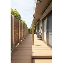 外からの視線をカットするフェンスも設置。外壁よりも少し濃い、明るい色味の人工木材を使用した。
