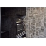 ご家族こだわりの「リアビタ」という自然な色ムラが美しいタイルと、クリナップ「セントロ」のクールなステンレス扉でラグジュアリーなキッチン。