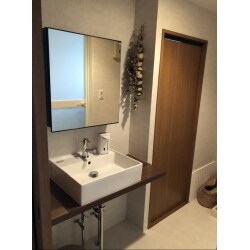 老朽化に伴い、「ホテルのように鏡が独立して、カウンターにボウルがのったオリジナルな造作風洗面台にリフォームしたい」とご相談頂きました。 お好みの仕様とテイストにピッタリなLIXIL「エスタ」を提案しました。 ホテルのように生活感を無くす演出をするために、カウンター下のキャビネットを撤去しました。足元をスッキリさせることで、非日常的な洗練された空間を演出しました。 背面の壁にはサッと取り出しやすいオープン棚を造作しました。 エスタの中に希望された鏡の仕様がなかった為、同メーカーの「ルミシス」の鏡を提案致しました。 キャビネット付きの立体感のある鏡を設置し、よりオリジナルで上質な空間になりました。