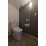 トイレのアクセントクロスも空間を引き締めるブラウンに、床にはセラミックタイル柄のクッションフロアを張って、住まい全体のイメージを統一感を持たせました。