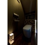 カフェの様なお洒落でシックな落ち着いたイメージの内装ですが、床は防汚性・清掃性を考えフローリング調のクッションフロアに。 天井のダウンライトを点けなくても人感センサーに反応し淡い明かりを灯すLED照明を設置。 便器は気に入っていただいた最新の「サティスG」を設置。 人感センサーで蓋が開き、跳ね・飛散を抑える「泡クッション機能」が付いています。以前の物より少ない水で流れる節水・エコロジーな便器は、汚れが付きにくく落としやすい「アクアセラミック」陶器でお掃除もラクなトイレです。 洗面化粧台は水栓が壁面から出ているので従来品の様な水栓周りの汚れが付きにくく、カウンタートップとボウル一体で縁など汚れが溜まりやすいところのないシームレスなデザインです。便器同様汚れにくく掃除がしやすいのはもちろん、実用面でも明るいLED照明と三面鏡で身づくろいが楽しくもなる洗面化粧台です。