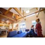 2間しかない2階に親子3人の暮らしを納めるために増築。更に屋根を架け替える事で空間を縦に広げ容積を拡大しました。 大空間を実現することで不安や不快にならないように耐震や断熱性能を上げ、長く安心して暮らしていただけるよう長期優良住宅の申請も行っています。またリビング全体を明るくするために高い位置にも窓を設け広い空間全体に光が届くよう工夫。ロフトを設けることで平面的な不足を補いました。現在はお子様の遊び場に、将来は収納として活用する予定です。またリビングを分けて子供部屋を作れるようドア、窓の配置を決め、可変性を持たせました。ロフト下はキッチンとダイニング、その横にはお父さんの書斎も設置。床はLDK全体にエイジング加工の無垢材を使い、感触のよさとお手入れの気兼ねなさを両立させています。 ロフト空間も共有する広いリビングには大きなソファが置かれ、高い天井を見上げながらのゴロゴロタイムは芝生で遊んでいるかのような開放感と心地よさ。おうち時間を楽しんでいただいています。