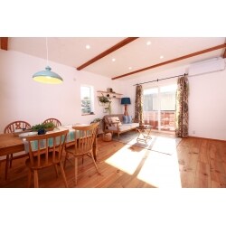 体に優しい自然素材のものにこだわりを持たれておりましたので、壁はすべて無添加の漆喰壁で仕上げ、床板は無垢材を使用し、裸足でも肌触りの良い床に仕上げました。温かみのある木目を生かした設備を使用したいとのことでしたので、キッチン、洗面台はウッドワンのものを使用いたしました。自分達の好みの雰囲気に仕上がり、カフェのようにゆっくりくつろげるリビングダイニングに大満足です!とのお言葉をいただくことができ、お客様にご満足いただけて、弊社としてもとても嬉しい限りです。