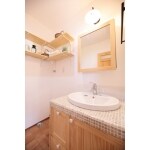 そのままお部屋の片隅にあっても、素敵なインテリアになりそうな、可愛らしいウッドワン 無垢の木の洗面台。タイルカウンター下と鏡裏にも収納があるので、洗面廻りがスッキリ片付きます。アンティーク調の鏡上の照明もポイントです。