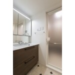 既存の位置と向きを変えた洗面は、こだわりのパーツを組み合わせて自分スタイルの空間が作れるTOTOのエスクアを選定そ、ロイダルブラウンのカラーで浴室と統一感を持たせました、トレンドの黒い取っ手と、ダイヤ柄がアクセントになったクッションフロアで上手くコーディネート。
