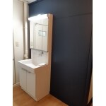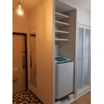 洗濯機の位置を真反対にして、元々下駄箱として使われていた収納スペースを、洗面側に利用した形です。これにより通路が広々。洗濯はもちろん、洗面台やトイレにも行きやすくなりました。
