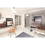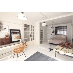 家族構成の変化を機に、1階の2間つづきの和室と洋室をご夫婦の寝室へとリフォームされました。和室特融の長押や和天井はそのままに、塗装と建具類の変更によって、イメージを一新しました。壁や天井は奥さまご自身で塗装を行い、手づくりの温もりを感じさせる空間に。こだわりのアンティークドアも、枠をつくってサイズ調整することで日本家屋の寸法にぴたりとフィットさせました。長屋形式の建物のため、境界壁の遮音性も検討事項でしたが、緩衝空間となる収納を設け、内部に遮音パネルと吸音ウールを設置することで、快適に過ごせる環境を整えました。