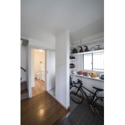 老朽化した浴室のユニットバス化に合わせて、玄関及びトイレ・洗面脱衣室の狭さや収納不足を改善しました。思い切ってトイレを洗面脱衣室内に移設し、玄関スペースを30センチ拡張。「1点に集中していたトイレ・洗面・階段の動線も改善されて、風も通り抜けるようになりました」とお客様。アウトドア用品を並べた棚の下には、これまで玄関で邪魔になっていたロードバイクがぴったり納まり、玄関の一角が愛用品を飾るオープンシェルフに変身しました。
