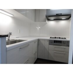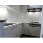 お客様の要望である清潔感に合わせ、白をベースのキッチンにさせて頂きました。また、キッチンでの作業をしやすい様子にL型キッチンをお勧めしました。