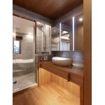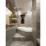 終の棲家として中古マンションを購入されたお客様。浴室をリフォームするにあたり心に描いたのは、ご夫婦ともに大好きな海外のリゾートホテルでした。リビングに張り出していた水廻りを再配置し、さらに両室の間仕切りガラスを用いることでリビングには広がりを、浴室には開放感を生み出しています。ユニットバスは長身のご主人様が足を延ばして入浴できる特注したものを採用し、素材の一つひとつにまでよりすぐった仕上がりに、お客様にも大満足いただき、世界にひとつだけの極上リゾートが完成しました。