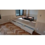 床はサーモタイルでヒヤッとしない 既存の白く見える所全てに薄くスライスした木を貼って塗装してある 新しく作るよりはコストダウンになる 窓には調光ができるロールスクリーンを設置