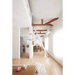 梁をそのまま現しにした木のあたたかみのある明るいLDK。 構造上ぬけなかった柱は、インターホンコーナーや飾り棚にした。