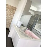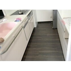 キッチン正面の垂壁を撤去し、広々としたLDKを実現。キッチン自体も拘り、トクラス製キッチンを採用。家事楽・お掃除楽に加え、デザイン性を重視し、人造大理石の明るい空間かつ可愛い扉カラーをご提案しました。