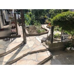 いつも奥様が大切にされているお庭を、もっと快適に楽しく過ごしていただけるようなプランをご提案しました。 気にされていた雨水のはけについて、集水マスへ傾斜をつける形で下地調整をおこなうことで改善しました。 またアプローチについて乱形石貼りをすることで、洋風で明るい印象のお庭空間になりました。