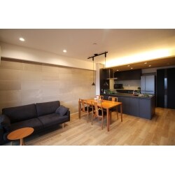 リビングの壁面に、アクセントとしてストーン柄のエコカラットを配置。クロスでは出ない高級感が出ます。 リビングと寝室との間仕切りには、ウッド調の縦格子を設置。 開放感を保ちつつもお部屋を分けることができるとても便利でオシャレなアイテムです! 今回は格子の角度にこだわり、家族がくつろぐソファーからは奥の寝室部分が透けて見え、来客者の位置からは寝室部分が見えないような角度に設置いたしました。開放感と目隠しの相反するニーズを同時にかなえることができます。