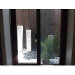 縁側に洗面所とお風呂を新設しました。窓から眺める坪庭は、窓の高さに合わせてつくりました。本宅からの視線も遮る高さに焼き板を貼目隠ししました。