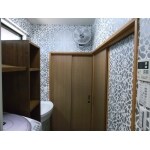 作り付けの棚を設置し収納を増やして、少し高めの窓で、本宅からの視線を遮り、換気のできるようにしました。