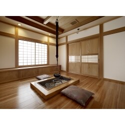 囲炉裏は、さまざまな商品の中からお客様がセレクトした。床は節のない桜の無垢材、幅木は香り豊かな檜、天井は、空間にリズム感を与える杉板目の目透かし天井とし、日ごろの疲れを癒す温もりのある空間に仕上げた。