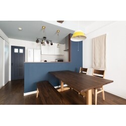リビング空間は、不要な間仕切り壁を取り、開放感が出るように広げました。 床はウォルナット、そして壁紙にこだわりカフェ風の室内に。 キッチン後ろの、洗面脱衣室の扉をこだわりました。 チェッカーガラスにネイビーのヴィンテージ扉。 リビング空間とのバランスもバッチリ、際立つポイントになっています。