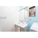 新しい洗面化粧台。壁にはデザインタイルを施工しました。