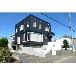 青い空に黒い外壁が映えます。屋根の青がアクセントとなり更にデザイン性UP