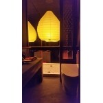 サッシは隠して古材や古建具・大谷石 墨入りモルタル・提灯・鏡・玉砂利と たくさんの素材を盛り込んで 素敵なトイレに変身。 ずっと居られるトイレです