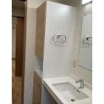 トイレ内手洗いカウンターには、キャビネットを隣接し、収納量をアップ。また、自動手洗い器としているので、カウンター上部が濡れにくく使用感を高めています。
