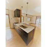 ご要望により吊戸棚と垂壁を撤去してキッチンの手元用にペンダントライトを2台吊下げました。 キッチン背面側にもシステム収納を設置して収納力を確保しました。