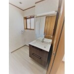 淡い木目のフローリング調クッションフロアにホワイト基調のクロスで清潔感のある洗面脱衣室に仕上がりました。