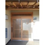 現在数が増えてきている、欄間無しの玄関引戸はご希望ではない。 欄間付きの縦格子のたくさん入った玄関引戸に取り換えました。 色:新槙調(木目) 鍵:新しくなったので、スムーズに開閉して頂けます