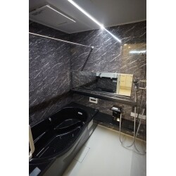 浴槽・カウンターはブラックで統一し、壁パネルは大理石調のグリジオカルニコ柄というデザインを採用しています。